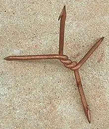 Простые варианты могут быть скручены из проволоки, наподобие шипов колючей проволоки, либо изготовлены путём отрезания с колючей проволоки «колючек», но эффективность от них будет небольшая — только против пешего человека, идущего босиком или в непрочной обуви. Впрочем, такие «колючки», разбросанные в большом количестве (в среднем более одной на площадь, равную площади ступни), способны, вонзаясь в подошву и оставаясь в ней, замедлить продвижение даже человека, обутого в обувь с толстой подошвой. Во время войны во Вьетнаме американцы были вынуждены использовать ботинки со стальными пластинами в подошвах для защиты от выставляемых противником шипов[9]. Ещё один вид подобного заграждения — доска со вбитыми в неё и торчащими вверх гвоздями.