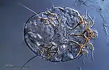 Самки чесоточных клещей роют в верхних слоях кожи ходы и откладывают там яйца. Спустя 4-6 недель после заражения у носителя возникает аллергическая реакция, проявляющаяся в виде зуда и папуловезикулёзной сыпи, часто с присоединением вторичных гнойничковых элементов вследствие инфицирования при расчесывании. Лечение чесотки проводят при помощи инсектицидов.