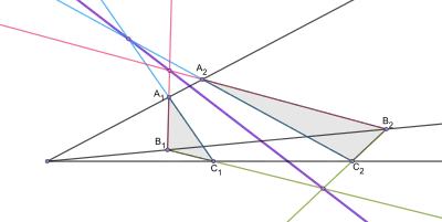 то три точки, в которых пересекаются продолжения трёх пар соответственных сторон треугольников,