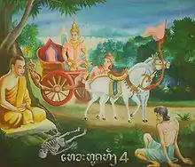 В молодые годы принц Сиддхартха вёл замкнутый образ жизни в окружении роскоши и удовольствий и впервые рискнул покинуть свой дворец в возрасте 29 лет[2][3][4]. Он отправился в город на колеснице в сопровождении своего возницы Чанны (санскр. Chandaka)[5].