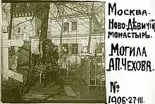 Гроб с телом Чехова был доставлен в Москву. 9 (22) июля 1904 года состоялись похороны. В Успенской церкви Новодевичьего монастыря прошло отпевание. Чехов был погребён тут же за Успенской церковью на монастырском кладбище, рядом с могилой своего отца. На могиле был поставлен деревянный крест с иконой и фонариком для лампады. В годовщину смерти 2 (15) июля 1908 года на могиле был открыт новый мраморный памятник, выполненный в стиле модерн по проекту художника Л. М. Браиловского[32]. В 1933 году, после упразднения кладбища на территории Новодевичьего монастыря, по просьбе О. Л. Книппер состоялось перезахоронение Чехова на кладбище за южной стеной монастыря. 16 ноября 1933 года в присутствии немногочисленных родственников и близких знакомых писателя его могила была вскрыта, и гроб на руках был перенесён на новое место. Вскоре сюда были перенесены и оба надгробия — А. П. Чехова и его отца (при этом захоронение П. E. Чехова было оставлено на старом месте)[33].