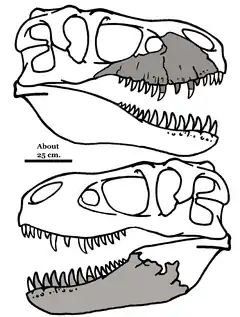 По мнению специалистов, высота ящера была 4 метра, а длина — около 11 метров. Это был один из крупнейших хищных динозавров в истории, которые на сегодня известны палеонтологам. По размерам он конкурирует со знаменитым тираннозавром, чья длина превышала 12 м, а высота — 5—6 м[5][6]. Однако, новый вид, судя по признакам строения челюстей, немного уступал тираннозавру в размере своих зубов[2][7].