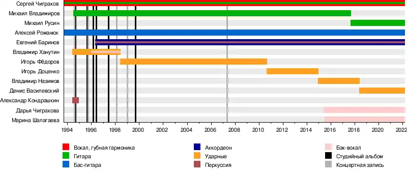 - Сергей «Чиж» Чиграков — вокал, гитары, клавишные, губная гармоника и другие инструменты, автор музыки и текстов (1993—наши дни)