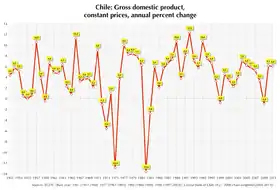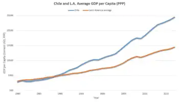 Сменявшие друг друга правительства продолжали эту же экономическую политику. В 2002 году Чили подписала соглашение об ассоциации с Европейским союзом (включающее свободную торговлю, политические и культурные соглашения), в 2003 году — обширное соглашение о свободной торговле с США, а в 2004 году — с Южной Кореей, ожидая бум импорта и экспорта. Продолжая стратегию свободной торговли, в августе 2006 года президент Мишель Бачелет обнародовала соглашение о свободной торговле с Китайской Народной Республикой (подписанное при предыдущей администрации Рикардо Лагоса), первое китайское соглашение о свободной торговле с латиноамериканским государством; аналогичные сделки с Японией и Индией были обнародованы в августе 2007 года. В 2010 году Чили была первой страной в Южной Америке, получившей членство в Организации экономического сотрудничества и развития. Согласно данным Всемирного банка, Чили с 2012 года относится к категории стран с высоким уровнем доходов.[42][43]