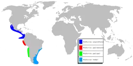 Ареал M. g. gayi (зелёный), M. g. peruanus (красный), и некоторые другие подвиды (голубой) |