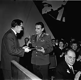 ![]() Председатель Калужского горисполкома Г. Н. Чиликин поздравляет лётчика-космонавта СССР В. М. Комарова с присвоением звания почётного гражданина г. Калуги (9 апреля 1966) | |