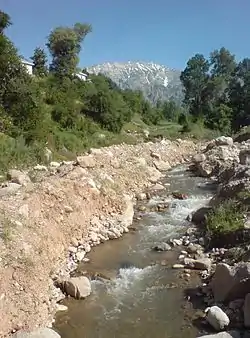 Чимгансай в среднем течении, населённый пункт Чимган.На заднем плане — гора Большой Чимган | |