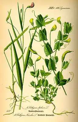 ![]() Ботаническая иллюстрация из книги О. В. Томе Flora von Deutschland, Österreich und der Schweiz, 1885 Lathyrus nissolia (слева) Lathyrus aphaca (справа) | ||||||||||||||