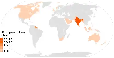 Большинство индуистов (814 млн) проживают в Азии, где они составляют 22,6 % населения. В Океании индуисты (439 тыс.) составляют 1,5 % населения. Доля индуистов в населении остальных частей света не превышает 1 %. В Африке проживает 2,5 млн индуистов, в Северной Америке — 1,8 млн, в Европе 871 тыс., в Латинской Америке — 747 тыс.[7]
