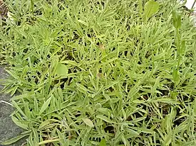 Листья многочисленные, линейно-ланцетные или продолговатые, с параллельным жилкованием, серые, суженные в черешок.