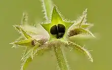 Плод — тёмно-бурый, гладкий, широко яйцевидный орешек.
