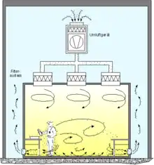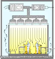 ![]() Потоки воздуха в чистой комнате с ламинарной организацией вентиляции |