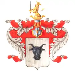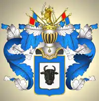 В серебряном поле бычья голова чёрного цвета (польский герб Буйволова голова). Щит увенчан обыкновенным дворянским шлемом с дворянскою на нём Короной, на поверхности которой виден Лев в Короне, имеющий в лапе Меч острием вверх поднятый. Намёт на щите серебряный, подложенный красным.
