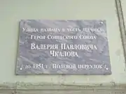 - Имя Чкалова ранее носила московская улица Земляной Вал (часть Садового кольца), где стоит дом, в котором жил Чкалов. На этом доме есть мемориальная доска со словами «В этом доме жил великий лётчик нашего времени, Герой Советского Союза Валерий Павлович Чкалов».