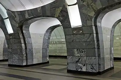 Пилоны отделаны серо-голубым мрамором, пол выложен чёрным, серым и розовым гранитом. Путевые стены отделаны белым мрамором. На пилонах и своде станции расположены оригинальные светильники.