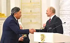 ![]() Евгений Чойнзонов во время вручения Государственной премии Российской Федерации. 12 июня 2021 года | |