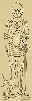 ![]() Посмертное изображение Томаса Чосера в церкви Юэлма, Оксфордир, напечатанное в 1911 году в книге «Спикеры палаты общин» | |