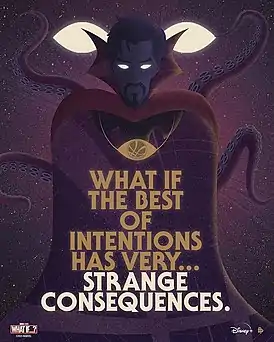 Создавая злую версию Доктора Стрэнджа, Майнердинг пришёл к мысли, что его изменили мистические существа, которых он поглощал, и создал «очень странно выглядящего, уродливого человека». Креативщики решили, что они всё ещё хотят, чтобы в персонаже узнавали Стрэнджа, поэтому Майнердинг вместо этого выбрал более человеческую версию персонажа, которая является измождённой, с более тёмным костюмом, более бледной кожей,[25] «более острыми и опасными» волосами и бородой[26] и тёмными кругами под глазами. Майнердинг описал это как «классический» образ злого персонажа.[25] Ещё один элемент, который был скорректирован — это плащ и воротник персонажа, которые стали больше, чтобы придать двум версиям Стрэнджа характерный силуэт.[27] Более чудовищные дизайны, которые первоначально создал Майнердинг, были возвращены для концовки эпизода.[26] Этот образ включает в себя различных существ, которые появляются в эпизоде, которые были основаны на идеях Эндрюса, Брэдли и художника-раскадровщика Арама Саркисяна, а не на каких-либо существующих персонажах «Marvel Comics».[23][28] Они разработали около 20 различных существ для этого эпизода и хотели, чтобы внешность была интересной как сама по себе, так и в том, как они могли бы временно слиться со Стрэнджем, когда он поглощает их.[28] Команда дизайнеров прошла через большее количество итераций Доктора Стрэнджа, чем многие другие персонажи сериала, поскольку они выясняли, насколько злым он должен быть изображён и насколько чудовищной должна быть его окончательная форма,[25] а также другие вариации, такие как персонаж в смокинге, раненые версии и от 10 до 15 вариаций того, как он поглощает различных существ.[28]