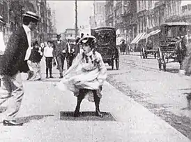 Женщина со своим мужем гуляет по 23 улице в Нью-Йорке. Вдруг горячий воздух поднимает её юбку. (Подобная сцена есть в комедии «Зуд седьмого года» с Мэрилин Монро).