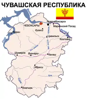 Чува́шская Респу́блика — Чувашия (чуваш. Чӑва́ш Республики́, Çovaş Respupliki, چأۋاش رەسپوپلېكې); кратко Чува́шия[7][8][9] (чуваш. Чӑва́ш Ен, Çovaş En, چأۋاش ەن) — субъект Российской Федерации, республика в её составе[10][11]. Столица — город Чебоксары[12].