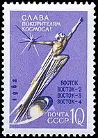 1962: «Слава покорителям космоса!». Монумент «В космос!» (скульптор Г. Постников), художник Н. Круглов (ЦФА [АО «Марка»] № 2764)
