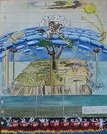 Верховный бог находился в верхнем мире. Он правил всем миром. Громы и молнии метал, дождь пускал на землю. В верхнем мире находились души святых и души не родившихся детей. Когда человек умирал, душа его по узенькому мосту, переходя на радугу, поднималась в верхний мир. А если он был грешен, то, не пройдя узкого моста, душа человека падала в нижний мир, в ад. В нижнем мире стояло девять котлов, где варились души грешных людей. Слуги дьявола непрестанно поддерживали под котлами огонь[6].