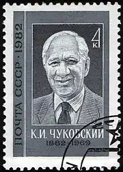 Корне́й Ива́нович Чуко́вский (имя при рождении — Николай Корнейчуков, 19 [31] марта 1882, Санкт-Петербург — 28 октября 1969, Москва) — русский советский поэт, публицист, литературный критик, переводчик и литературовед, детский писатель, журналист. Отец писателей Николая Корнеевича Чуковского и Лидии Корнеевны Чуковской. Самый издаваемый в Советском Союзе и России автор детской литературы: тираж книг Чуковского за 2017 год превысил два миллиона экземпляров[4].