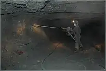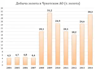 13 июля 2008 года депутатами Думы Чукотского автономного округа в ходе тайного голосования был единогласно утверждён в должности губернатора Чукотского автономного округа Копин Роман Валентинович, кандидатуру которого внёс на рассмотрение Думы Чукотского АО 11 июля 2008 года президент России Д. А. Медведев в связи с досрочной отставкой прежнего губернатора Чукотского автономного округа Р. А. Абрамовича. 8 сентября 2013 года Р. В. Копин избран губернатором Чукотского автономного округа. ЭкономикаОснову экономики округа составляет горнодобывающая промышленность. Коренное население занято традиционными видами промысла. По показателю ВРП на душу населения регион уступает лишь нефтедобывающим Тюменской и Сахалинской областям. Средняя зарплата на Чукотке составляет 71 тысячу рублей[44]. Доля государственных услуг в 2008 году составила около четверти ВРП. ВРП региона — 78 млрд р, 1,578 млн р\чел [45]. ПромышленностьПромышленное развитие Чукотка получила в конце 1930-х годов с организации добычи бурого (шахта Угольная) и каменного (шахта Нагорная) угля, который и поныне продолжает использоваться для собственных нужд региона. В 1940-х гоах в основном силами заключённых Чукотстройлага началось строительство оловодобывающих приисков, а также уранового рудника Северный, добыча на котором велась до 1953 года[46]. Новый этап в промышленном освоении региона начался с конца 1950-х годах с открытием богатых месторождений россыпного золота, для отработки которых были созданы крупные горно-обогатительные комбинаты — Билибинский, Полярнинский, Комсомольский; добычу олова и вольфрама продолжил Иультинский ГОК. Близ многочисленных приисков были основаны рабочие посёлки, население крупнейших из которых — Иультин и Полярный насчитывало свыше 5000 чел. ![]() Буровые работы на золотодобывающей шахте, месторождение Рывеем В 1970-х гг. было открыто и отработано ртутное месторождение Пламенное. Одноимённый посёлок горняков в дальнейшем использовался как перевалбаза оленеводческого хозяйства[47][48].