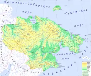 Горный пейзаж представлен в центральной части средневысотными Анадырским плоскогорьем и Анюйским нагорьем, над которыми возвышаются горные хребты высотой от 1 км, а также Чукотским нагорьем на востоке.