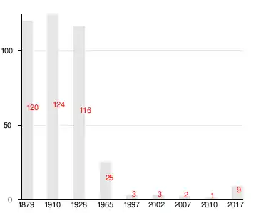 Число жителей по семейным спискам 1879 г.: 47 м. п., 73 ж. п.; по приходским сведениям 1879 г.: 39 м. п., 59 ж. п.[4]
