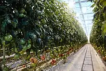 Томаты и огурцы выращиваются способом малообъемной гидропоники[4] — это современная технология, в которой почва заменена на минераловатный субстрат[5]. Для смачивания субстратов питательным раствором применяется капельное орошение, которое позволяет улучшать вкусовые качества овощей, увеличивать урожайность более, чем в 2 раза, а также экономить воду в 2 — 5 раз.