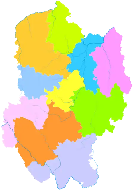 Чусюн-Ийский автономный округ делится на 1 городской уезд, 9 уездов:
