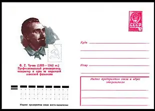 | Художественный маркированный конверт Министерства связи СССР, посвящённый Ф. Г. Чучину (1977) |