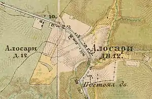 АЛОСАРИ — деревня вотчины Белоостровской, принадлежит Кайдановой, действительной статской советнице, жителей по ревизии 25 м. п., 29 ж. п. (1838 год)[6]