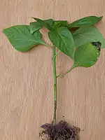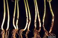 - картофеля (возбудитель — бактерии рода Dickeya[3]): основания стеблей загнивают от клубня, листья желтеют и скручиваются. Впоследствии клубни при хранении размягчаются и гниют. Развитию болезни способствует переувлажнение почвы[4].