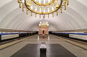К своду подземного зала станции подвешено восемь большого размера и оригинальной формы люстр. В люстры вмонтированы люминесцентные лампы. Путевые стены изначально были облицованы лабрадоритом, позже заменённым на габбро-норит, сверху размещается полоса белого мрамора, снизу — серый гранит.