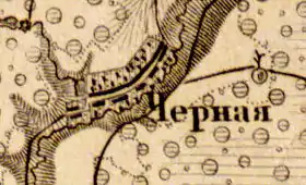 ЧЁРНАЯ — деревня владельческая при реке Леможе, по левую сторону просёлочной дороги от с. Рожествена к казённой Изварской лесной даче, число дворов — 75, число жителей: 206 м. п., 260 ж. п. (1862 год)[11]