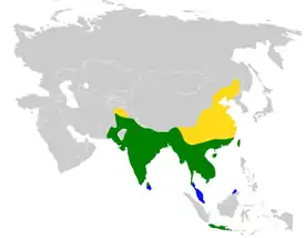 Распространен в Южной и Восточной Азии: от Ирана до Индии (здесь довольно обычный вид птиц), на юг до островов Шри-Ланка, на островах Ява и Бали (Индонезия).