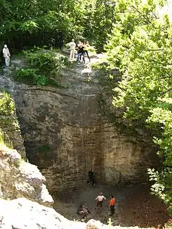 Львовская областная экспедиция Института украиноведения им. Ивана Крипякевича НАН Украины в 1973 году открыла и обследовала урочище Чёртова скала и площадки перед ним. В верхнем горизонте зафиксированы материалы XVIII—XX вв., а также фрагменты посуды эпохи раннего железа (скифский период) и многочисленные кости животных, в частности одомашненных. В горизонте II на глубинах от 50-65 см до 135—140 см обнаружены останки только диких животных (оленя благородного и северного, лисы, барсука, птиц и т. д.) и кремнёвые изделия, скребки и ножи. Датирование по С14 показало возраст этих находок — 8500 лет от наших дней. В горизонте III (от 135—140 до 200—205 см от поверхности) найдены останки мамонта, северного оленя, птиц, других животных, а из кремнёвых изделий — скребки, резцы и ножи (13 500 лет назад). В горизонте IV обнаружены кости мамонта, северного оленя, первообытного коня и других животных, а из каменных и костяных изделий — скребло, ножи и проколки. Комплекс датирован поздним палеолитом (27 200 лет назад).