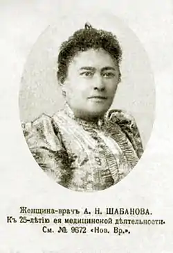 - Начиная с 1883 года благодаря усилиям А. Н. Шабановой списки женщин-врачей стали публиковаться в ежегодном издании «Российский медицинский список»[20]. Это было первым официальным признанием прав женщин на медицинскую практику в России.