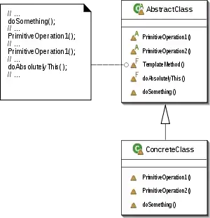 Abstract class (абстрактный класс) - определяет абстрактные операции, замещаемые в наследниках для реализации шагов алгоритма; реализует шаблонный метод, определяющий скелет алгоритма. Шаблонный метод вызывает замещаемые и другие, определенные в Abstract class, операции.
