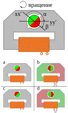 При отсутствии тока в обмотке магнитный поток постоянного магнита ротора замыкается через магнитопровод статора. При этом за счёт прорезей в стенке цилиндрического отверстия в магнитопроводе статора ротор ориентируется так, чтобы энергия магнитного поля была минимальна — плоскость проходящая через середину постоянного магнита проходит перпендикулярно прорезям статора (плоскость xx' на рисунке, состояние a). При подаче тока в обмотку статора наведённое магнитное поле в статоре развёртывает ротор на угол (плоскость yy' на рисунке, состояние b). После снятия тока с обмотки ротор снова стремится принять положение, заданное прорезями в статоре, но так как полярность магнитного поля статора при отсутствии тока в катушке индуцируется магнитным полем ротора, ротор поворачивается на меньший угол (состояние c). Для дальнейшего поворота ротора необходимо подать ток в обмотку в противоположной полярности, что снова заставит ротор повернуться на угол (состояние d) и после снятия тока выполнить полный оборот. Таким образом, подача чередующихся разнополярных импульсов тока в обмотку побуждает ротор вращаться в одну сторону.