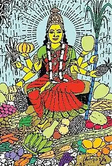 Шакамбари— воплощение вселенской матери Дурги в индуистской мифологии, в её аспекте плодородия. Согласно писаниям, злой демон Дургам хитростью выманил у Брахмы четыре Веды, и создал засуху, продолжавшуюся сто лет. Шакамбари победила его, после чего начался дождь, вернувший человечеству пищу.