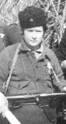 ![]() Групповое фото бойцов крымского партизанского отряда. Военкор Иван Запорожский, 1943. Фрагмент: разведчик — помощник комиссара по комсомольской работе 2-го района Северного соединения партизан Екатерина Николаевна Камардина (Шамко) | |