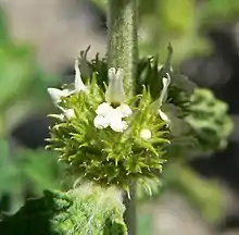 Цветки собраны в многоцветные ложные мутовки, густые, почти шаровидные; прицветники шиловидные, короче трубки чашечки или равны ей; чашечка с десятью шиловидными зубцами, густо опушена зубчатыми волосками; венчик белый, с цилиндрической трубочкой, коротковолосистый, верхняя губа равна нижней или немного короче её, двунадрезанная, нижняя — с широкопочковидной средней лопастью и небольшими боковыми лопастями.