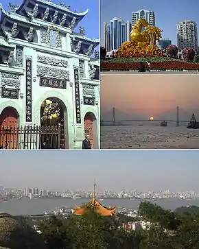 ![]() Сверху вниз, слева направо: храм Чжэнго (кит. 鸥汀证果寺) в районе Лунху, скульптура «Золотой петух объявляет хорошие новости» (кит. 金鸡报喜), мост Цюэши, вид на павильон Пяожань (кит. 飘然亭) и городской пейзаж за рекой Жунцзян | |