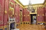 - 100 — Красная дамастовая комната (нем. Rote Damastkammer) — обтянутая красным дамастом и золотым позументом комната служила Фридриху I и его министрам местом проведения конференций. Существовали планы именно здесь разместить изготавливаемую немецкими мастерами Янтарную комнату, однако работы продолжились дольше запланированного и готовые янтарные панно были установлены в Берлинском дворце, откуда и попали в Россию[8][40].