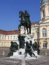 Попасть в Шарлоттенбургский дворец можно через площадь, с трёх сторон окружённую самим зданием и получившую название Парадного двора (нем. Ehrenhof), ворота которой «охраняются» двумя фигурами гладиаторов (копиями «Боргезского борца»), а ограда украшена восьмиконечными звёздами ордена Чёрного Орла[29]. На площади установлена бронзовая конная статуя Великого курфюрста Фридриха Вильгельма I, изготовленная в 1696—1700 годах по заказу его сына, Фридриха I, скульптором Андреасом Шлютером и литейщиком Иоганном Якоби (нем. Johann Jacobi)[30] и ставшая первой скульптурой подобного рода в Германии[31]. Находившаяся поначалу на Длинном мосту (нем. Lange Brücke) через Шпрее перед Берлинским Городским дворцом, композиция, включающая в себя также фигуры четырёх невольников, символизирующих различные темпераменты и покорённых курфюрстом врагов, была перенесена в Шарлотенбург в 1952 году, вследствие запрета сенатом Западного Берлина передачи статуи в Восточный Берлин, где оказалось прежнее местонахождение памятника после раздела Берлина между странами-победительницами во Второй мировой войне[32].