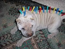 - Окрас. Шарпей имеет широкую палитру окрасов, делящихся на две группы. Шарпеи основного окраса имеют чёрный пигмент разной интенсивности. У одних собак это выражается в зачернении практически всей морды, у других — лишь в чёрной пигментации мочки носа и небольшой области вокруг него, у третьих чёрного пигмента так мало, что он проявляется только в виде серого налёта на морде или в местах шрамиков на коже. Среди пигментированных окрасов у шарпеев выделяют чёрный, олений, красный (махагоновый), кремовый, голубой, изабелловый и соболиный. Дильютная группа окрасов (с полным отсутствием чёрного) — дильюты шоколадный, красный, кремовый, абрикосовый, лиловый, изабелловый и соболиный[16].