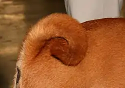 Толстый и круглый в основании, сужающийся к концу. Хвост посажен очень высоко — это отличительная особенность породы. Должен быть носим высоко и закручен в правильное кольцо или изогнут над спиной или к любой стороне спины.